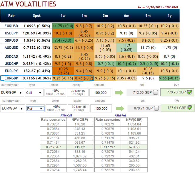 NPV of 1m ATM call is at 712.52 while the Premiums trading above 9.40% at GBP 779.73 for lot size 100,000 units.