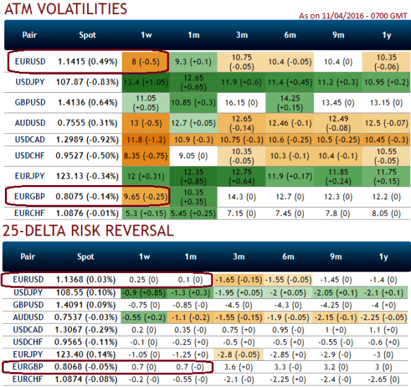 IV and risk reversal readings of EURUSD and EURGBP have been the best bets on shorting opportunity in options and buying signals respectively on the respite from sellers.