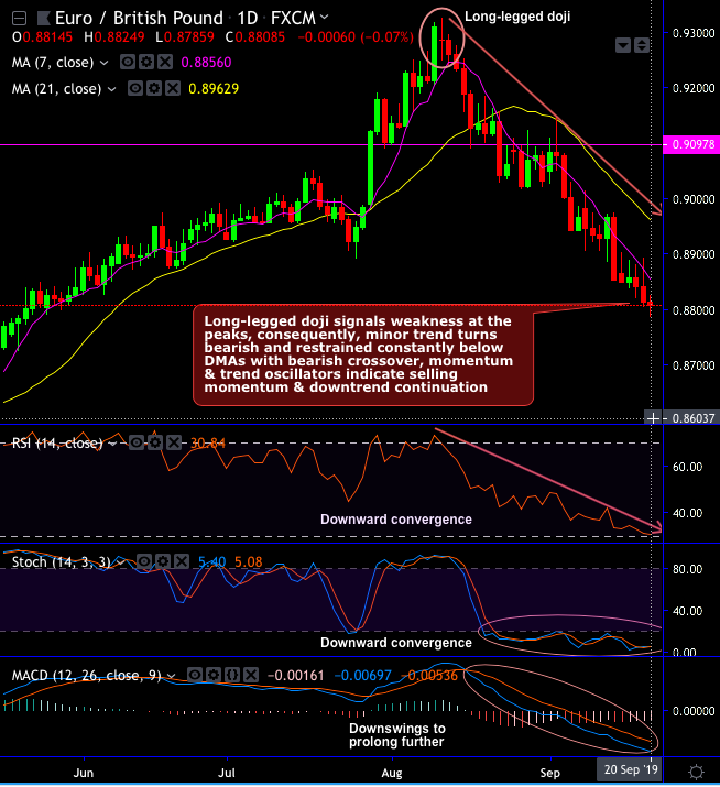 EURGBPminor trend has been grinding lower ever since the formation of long-legged doji at 0.9284 level that signals weakness at the peaks, consequently, bears were back in action to plummet the prices and restrained constantly below DMAs with bearish crossover. The momentum and trend oscillators indicate selling momentum & the downtrend continuation respectively.