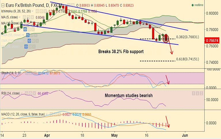 - EUR/GBP below the 0.7700 handle ahead of data, now breaks below 38.2% Fib level support at 0.7683.