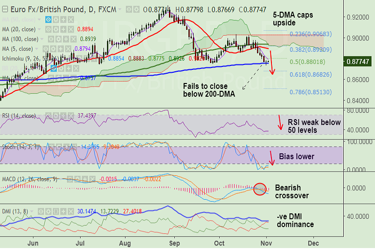 Support levels - 0.8899 (20-DMA), 0.8842 (5-DMA), 0.8760 (200-DMA), 0.8733 (Nov 1 low), 0.8682 (61.8% Fib retrace of 0.8297 to 0.93065 rally)