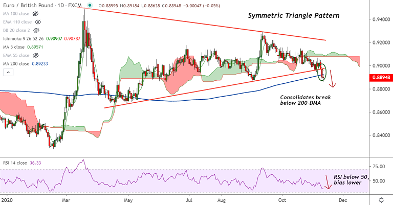 The pair was trading 0.11% lower on the day after closing 0.79% lower in the previous session. Price action has breach crucial support levels raising scope for further downside.