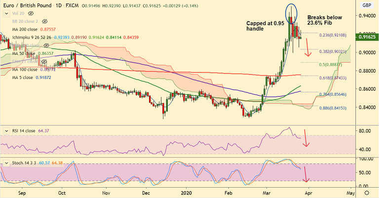 Technicals suggest EUR/GBP is set to extend weakness. 5-DMA is sharply lower and Stochs and RSI have rolled over from overbought levels.