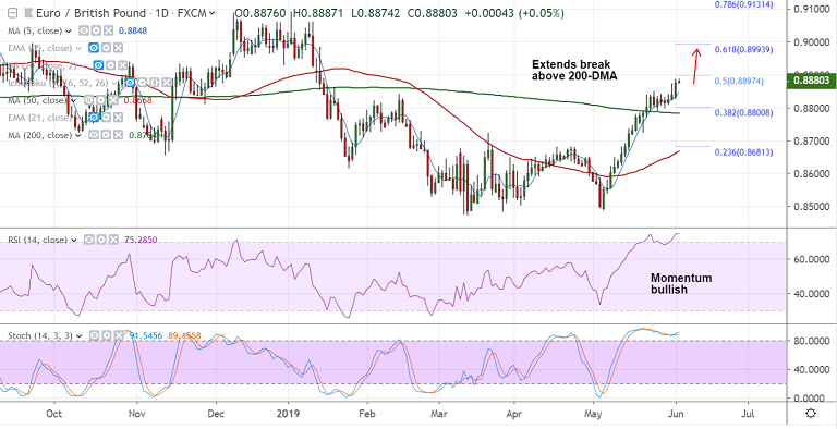 The pair is extending breakout at 200-DMA, momentum studies are bullish.