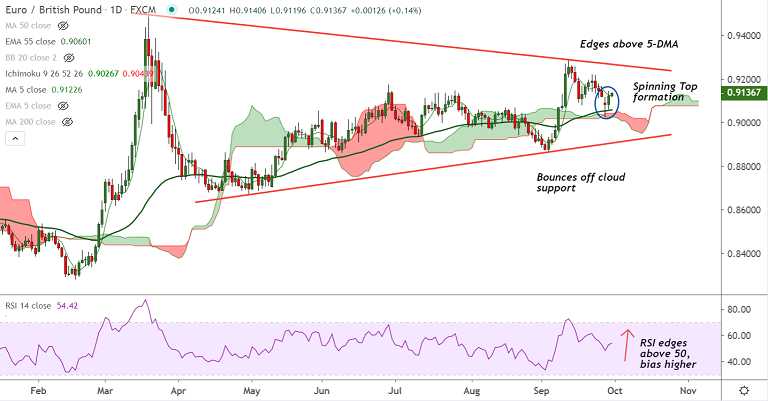 Summary: Technical studies support further gains in the pair. Price action is extending bounce off cloud support. Scope for test of trendline resistance at 0.9340.