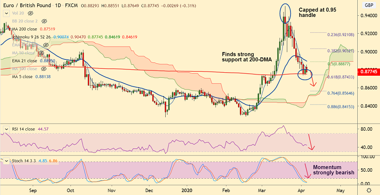 Break below 200-DMA will see resumption of weakness. Next immediate support lies at 110-EMA at 0.8698 ahead of 50-DMA at 0.8685.