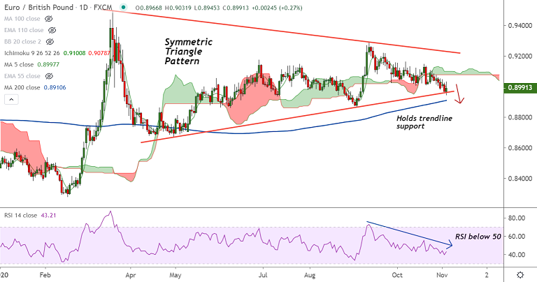 The pair is trading in a 'Symmetric Triangle' patter and is testing support at 'Triangle Base'.