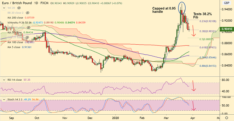 Technicals suggest EUR/GBP is set to extend weakness. 5-DMA is sharply lower and Stochs and RSI have rolled over from overbought levels.