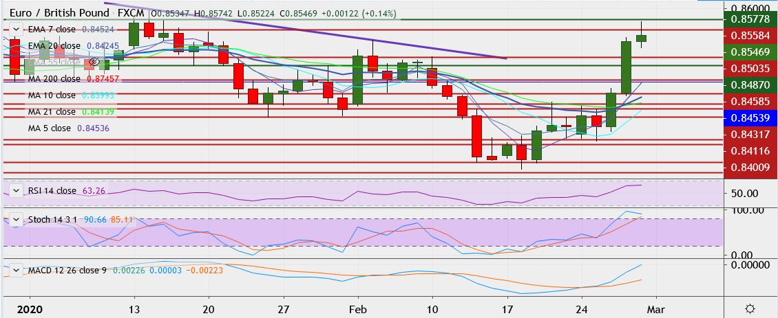 - Immediate resistance is located at 0.8589, a break above could take it near 0.8605.