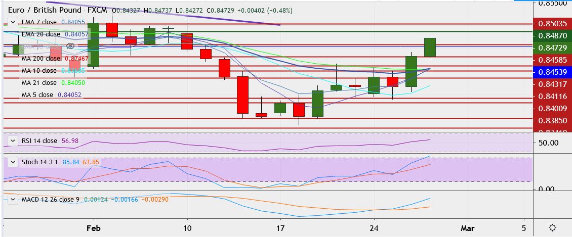 - Immediate resistance is located at 0.8487, a break above could take it near 0.8504.