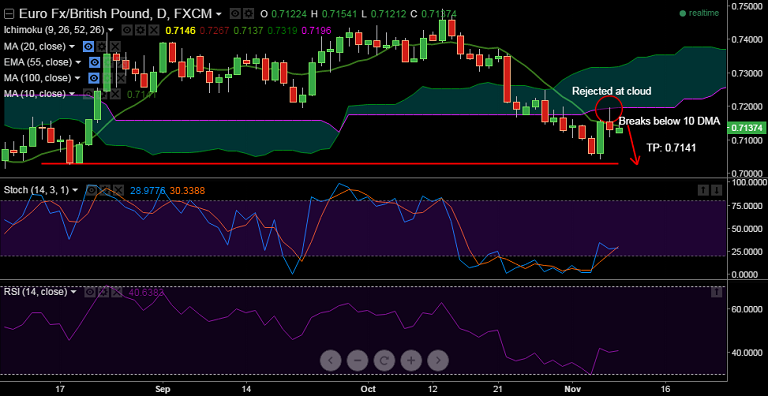 EUR/GBP was rejected at cloud base by 0.7196 on Friday. The pair has retraced from 0.7196 levels, was modestly bid in Asia, 0.7126 - 0.7146 range and is currently trading at 0.7141.