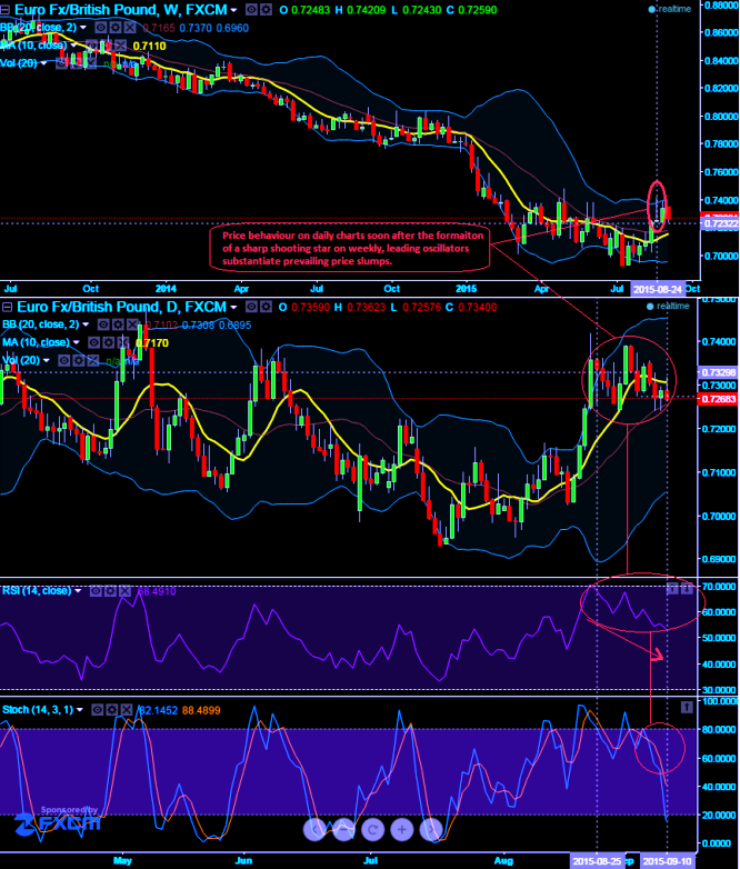 A sharp shooting star pattern candle occurred at 0.7289 on weekly technical charts on 24th of August that is signifying down-streak again now in daily charting. This pair had bounced from 0.7031 (lows of 19th) to 0.7420 levels, that is the time when this bearish pattern formed. Since then you can observe the price actuion on daily chart. The convergence on RSI is seen on daily charts as it is trending near 57.1700 levels with a supportive signal from stochastic curve as %D line crossover above 80 levels which indicates overbought pressure. These signals can be attributed as supportive movers for those who expect price slumps.