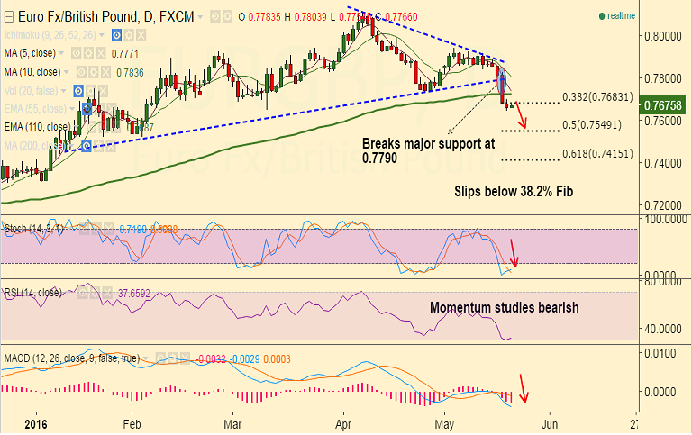 - On the dailies the pair has broken below 38.2% Fib level at 0.7683 and hit lows of 0.7648 on Thursday's trade.