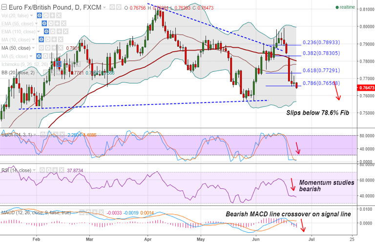 - EUR/GBP has slipped below the 78% Fibo level and is currently trading around 0.7645 levels.