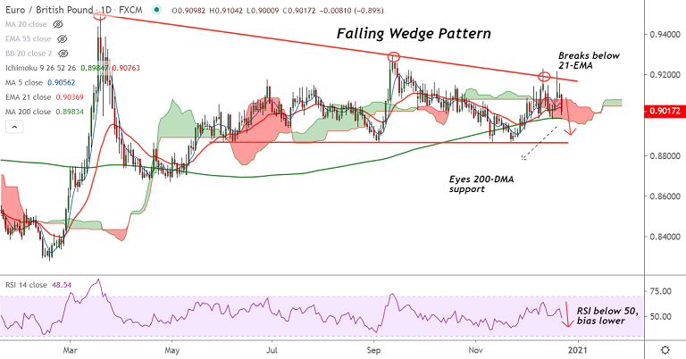 EUR/GBP was trading 0.80% lower on the day at 0.9026 at around 14:50 GMT, outlook bearish.