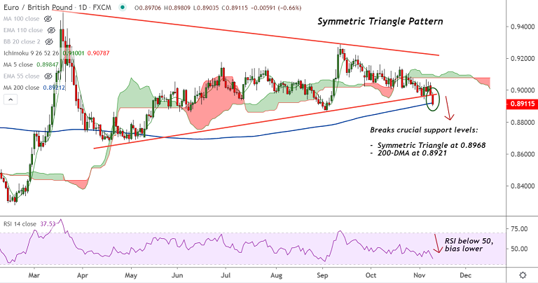 Price action has breach crucial support levels at 'Symmetric Triangle' at 0.8968 and 200-DMA at 0.8921, raising scope for further downside.