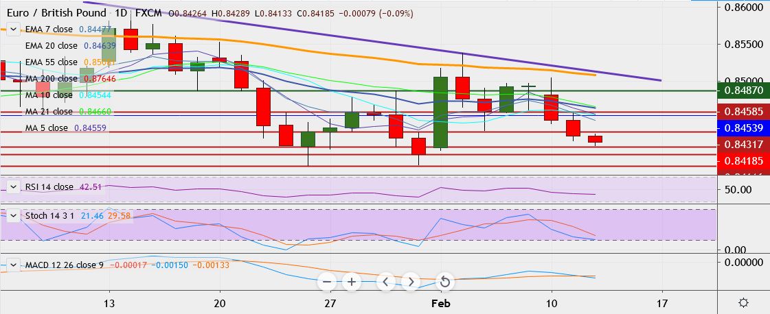 - EUR/GBP is trading 0.1 percent down at 0.8416, having hit a low of 0.8413 earlier, its lowest since February 3.