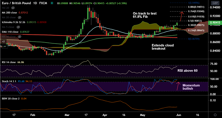 EUR/GBP has edged slightly lower from 2-month highs at 0.9054, bias remains strongly bullish.