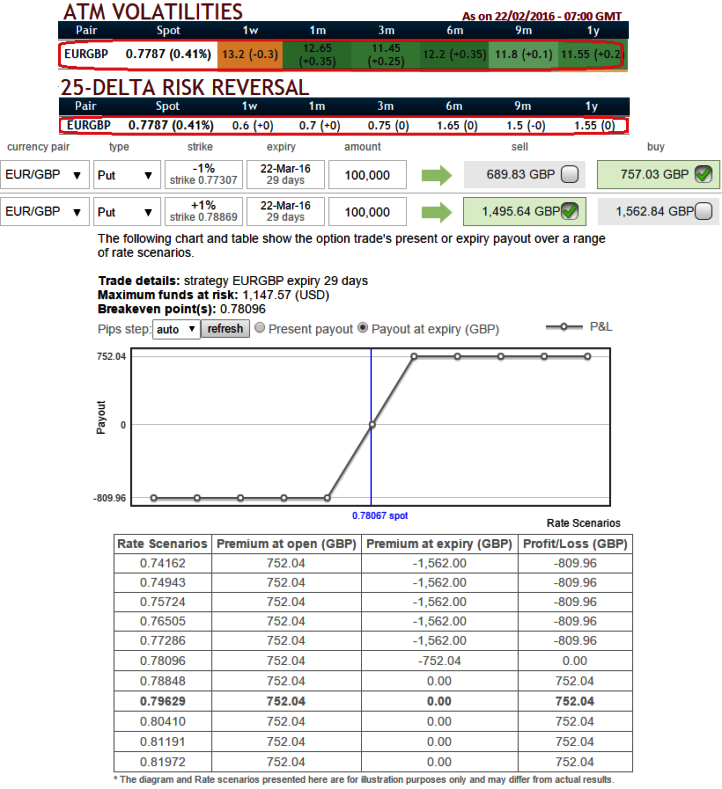 At this point of time, if you expect that EURGBP will mildly spike up over the next fortnight or so, spot FX is currently at 0.7812. And if you think calls are priced in expensive, then buy 1M (1%) Out of the money -0.37 delta put option. Simultaneously, short 1W (-1%) in the money put with positive theta, So thereby our breakeven would be at 0.7568.