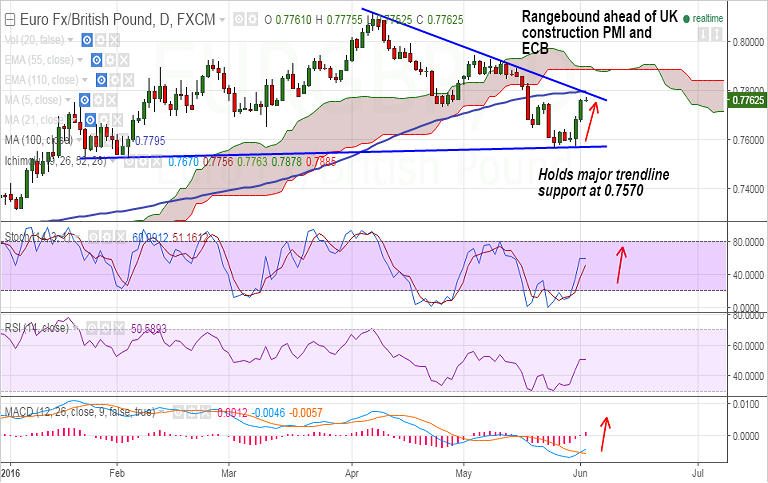 - PMI reading matching or better expectations could see EUR/GBP slip to 0.77 and then 0.7680. Contrarily, disappointing result should see upside upto 0.7795 and 0.78 levels.