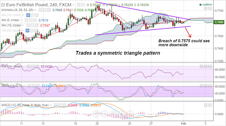 EUR/GBP has been trading a tight range, day's high at 0.7613 and lows by 0.7596, bias is lower.