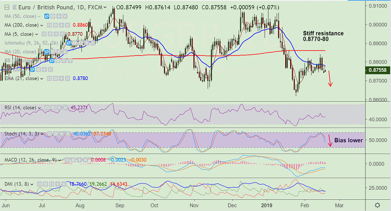 - The pair is struggling to extend upside, finds stiff resistance at 0.8770 to 0.8780 zone.