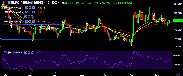 We prefer to go long on EUR/INR around 79.10, stop loss at 78.80 and target of 79.63.