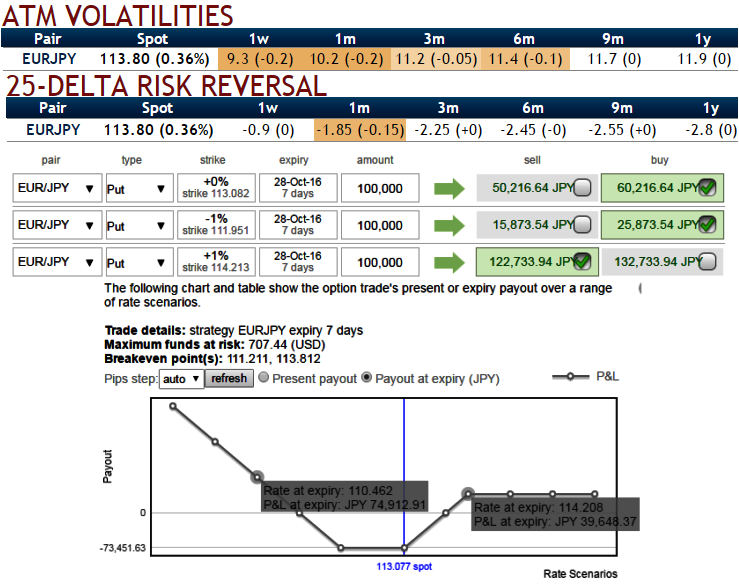 Acknowledging the gradual decrease in the implied volatility of EURJPY but with higher negative risk reversals in long run is justifiable when you have to anticipate forwards rates and observe the spot curve of this pair (see IVs, RR nutshell, Sensitivities, and compare with spot prices).