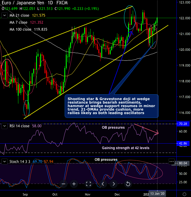 Hence, on trading perspective, at spot reference: 121.963 levels, contemplating above technical rationale it is advisable to trade one-touch calls to participate in prevailing rallies, using upper strikes at 122.500 levels.