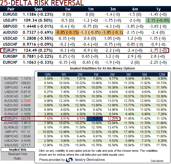 Acknowledging the gradual increase in the implied volatility of EURJPY but with higher negative risk reversals in long run is justifiable when you have to anticipate forwards rates and observe the spot curve of this pair (see IVs, RR nutshell, Sensitivities, and compare with spot prices).