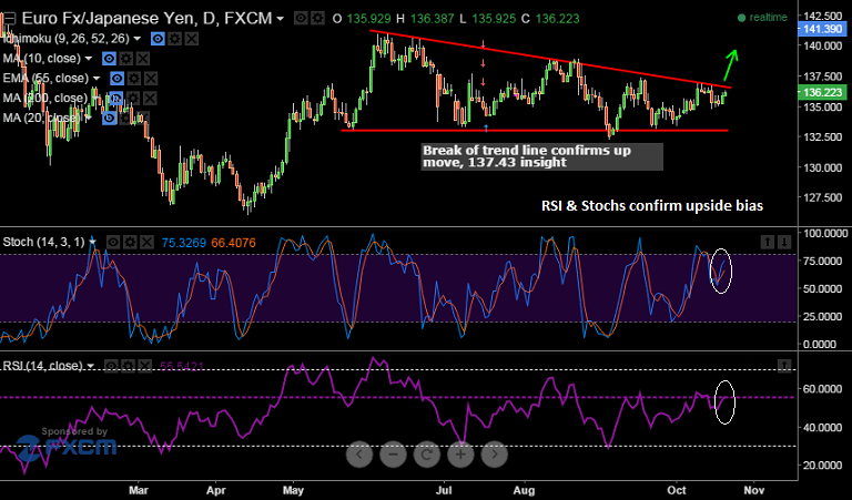 - EUR/JPY is currently trading at 136.30, with immediate resistance at 136.58 (trend line resistance), breaks above could see the pair at 137.43 levels