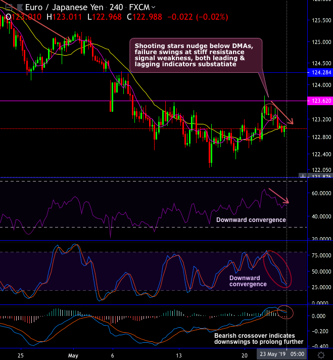 Technical chart and candlestick patterns formed: Shooting stars have occurred at 123.323 and 123.256 levels on the failure swings at the stiff resistance of 123.620 levels (refer daily chart).