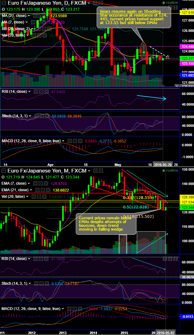 Bears resume again on "Shooting Star" occurrence at resistance of 124.445, current prices tested support at 123.55 but still below DMAs.