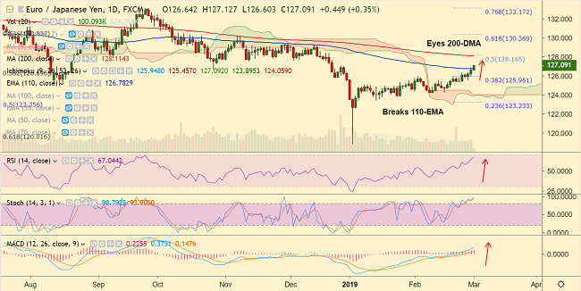 - EUR/JPY is trading at 127.08 at 0640 GMT, up 0.35% at the time of writing.
