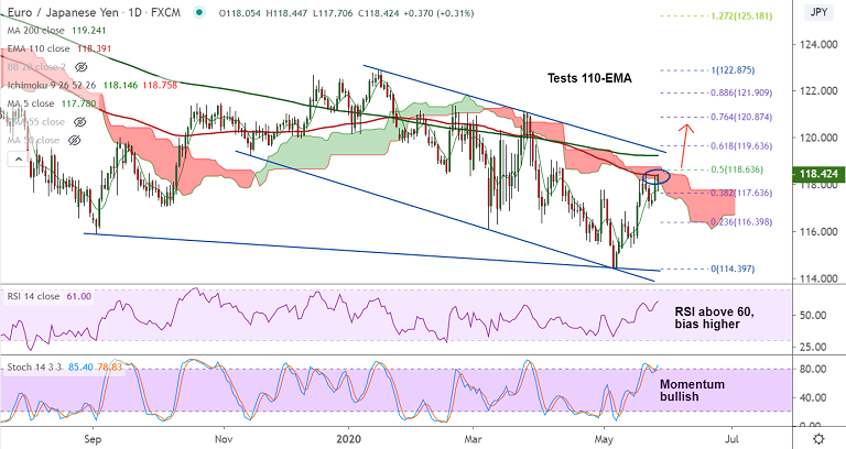 EUR/JPY erases losses and spikes higher to break above 110-EMA resistance at 118.39.