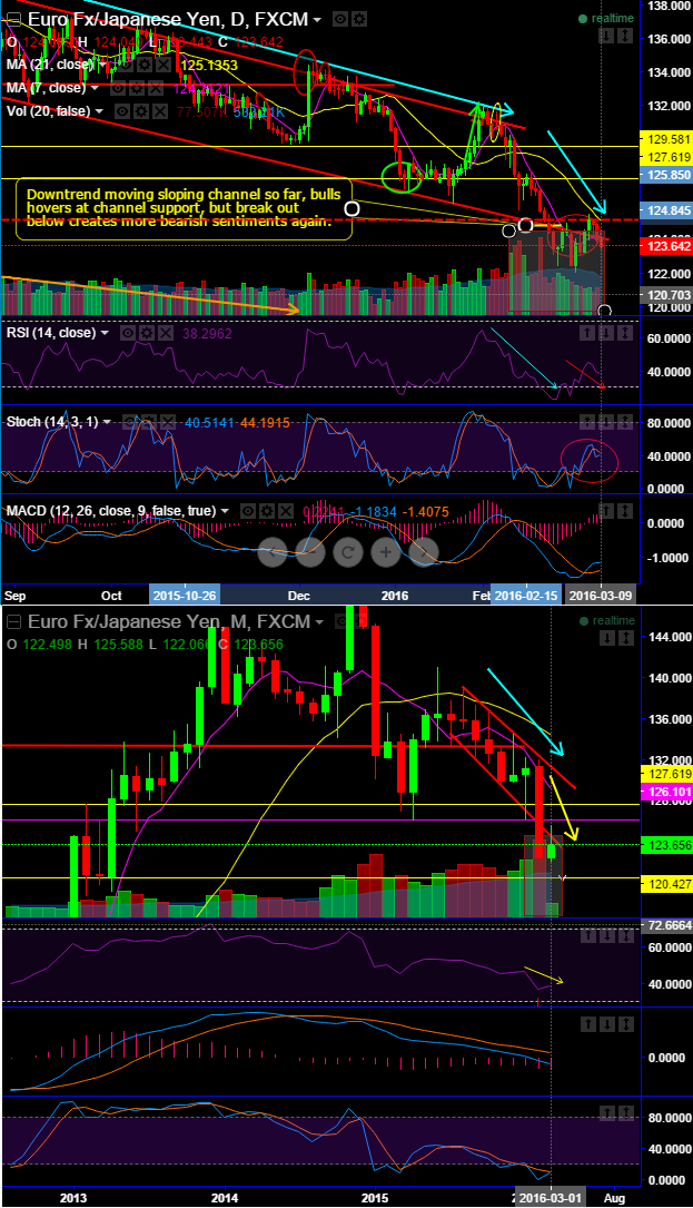 Major downtrend drifting southwards in sloping channel but channel base at 122.498 is also broken that signifies the intensity in the major downtrend.