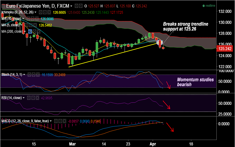 - Immediate support is seen at 125, breaks below will take the pair to next supports at 124.67 (Mar 22nd lows) and then 124.41 (61.8% Fib retrace of 112.058 to 128.221 rise).