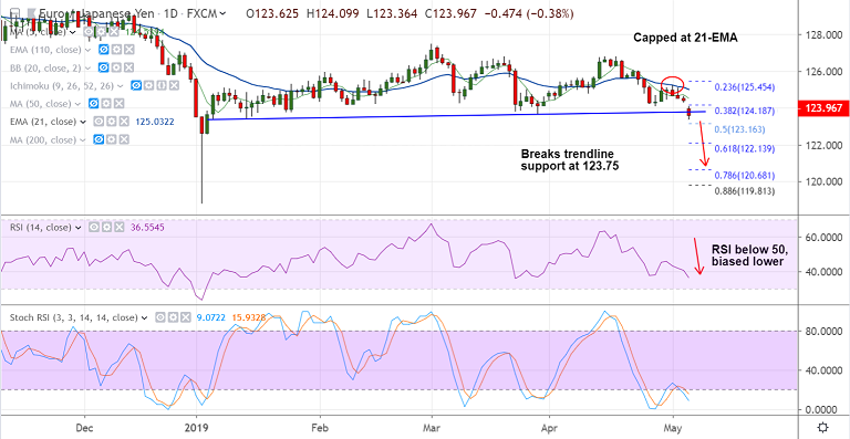 - The pair has broken strong trendline support at 123.75, bias bearish.