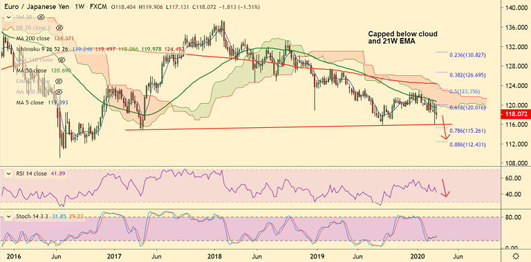 EUR/JPY has failed to sustain Friday's massive gains. Upside has been capped at 200-DMA which is stiff resistance (currently at 120.10).