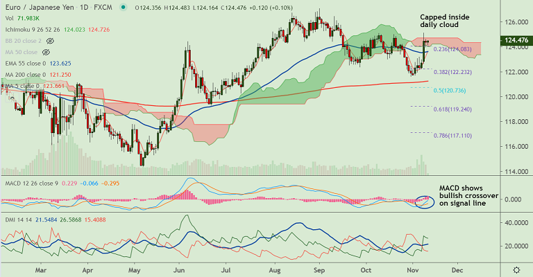 Support levels - 123.62 (nearly converged 5-DMA and 55-EMA), 123.22 (38.2% Fib), 123.09 (110-EMA)