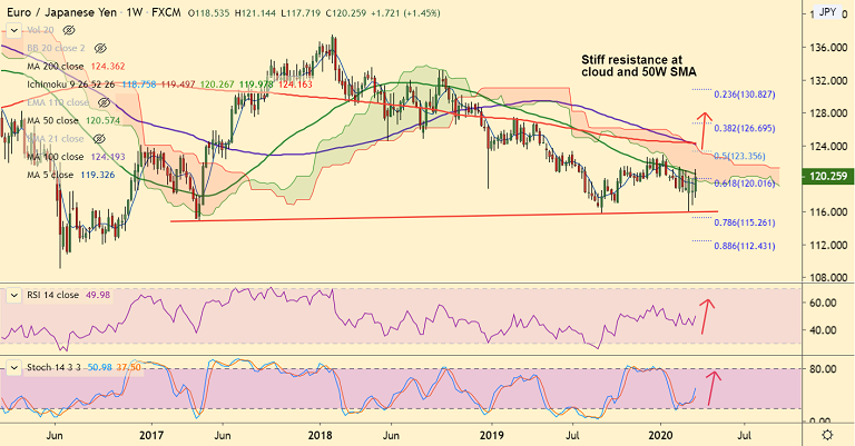 The pair currently finds stiff resistance at 50W SMA at 120.58. Break above to confirm further gains.