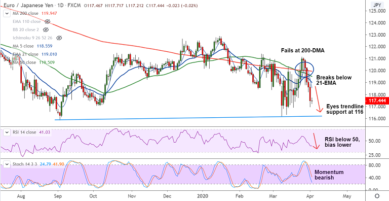 The pair has resumed downside after failure to break above 50W MA. Scope for test of trendline support at 116.