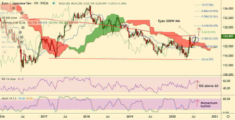 EUR/JPY hit highest since June 2020 (124.29), buoyed by the European Union's decision to approve the highly-anticipated EUR 750 billion recovery fund.