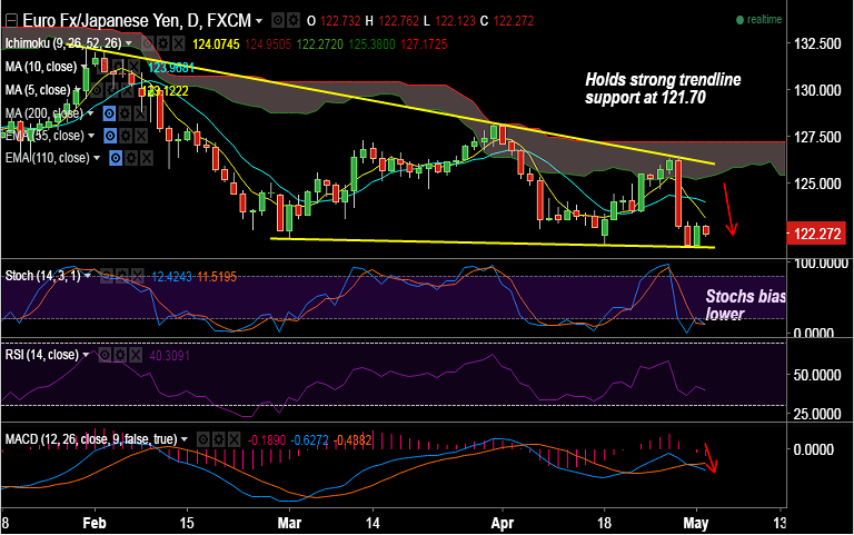 - On the flip side, support is seen at 122.05 (Mar 1st lows), 121.71 (April 18th lows) below which it could extend losses to towards 121.63 (3-year low).