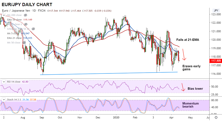 EUR/JPY erases early gains to slip into negative territory, scope for further weakness.