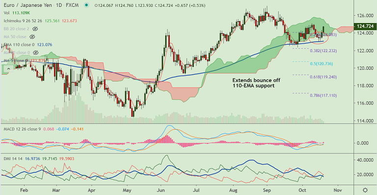Support levels - 124.07 (21-EMA), 123.83 (20-DMA), 123.07 (110-EMA)