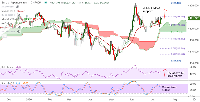 Clear break above 122.27 will fuel further upside. Bullish invalidation only below 200-DMA.
