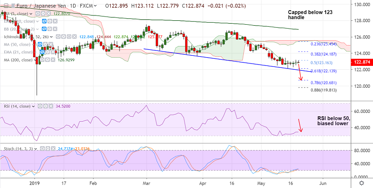 Recovery capped below 123 handle. Break above will see upside till 123.70 (20-DMA).