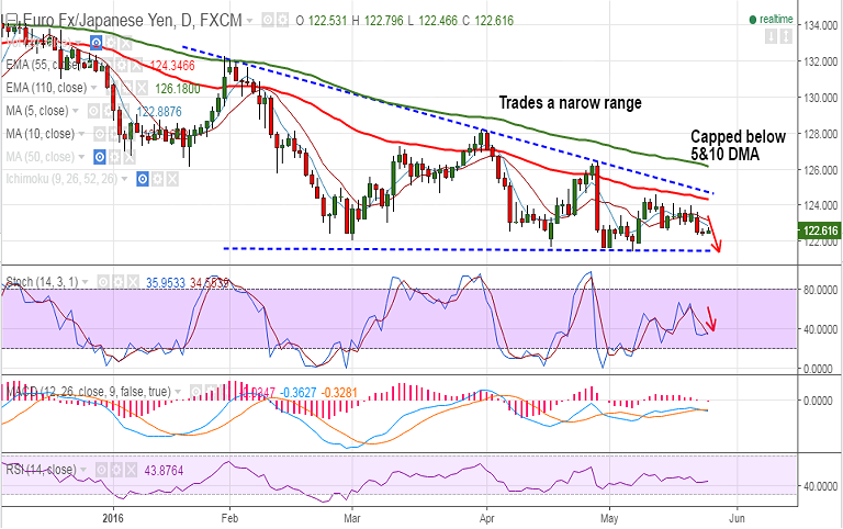 - EUR/JPY is extending range trade for a second consecutive day, with day's highs at 122.79 and lows at 122.46.