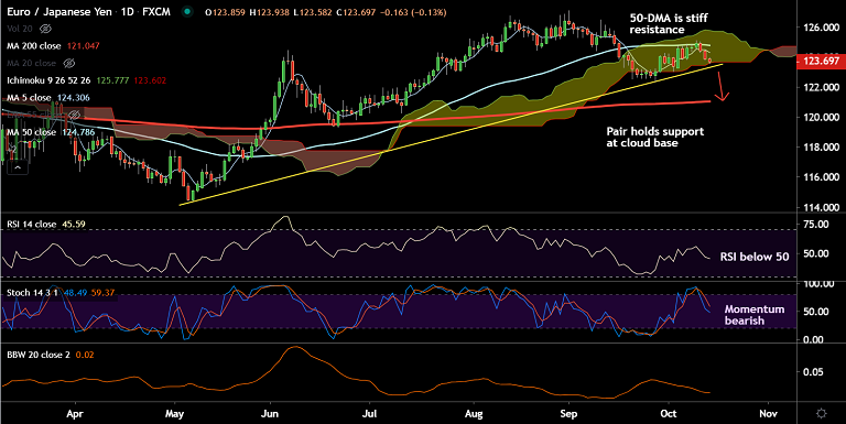 Break below cloud will drag prices lower. Scope for test of 200-DMA at 121.04.